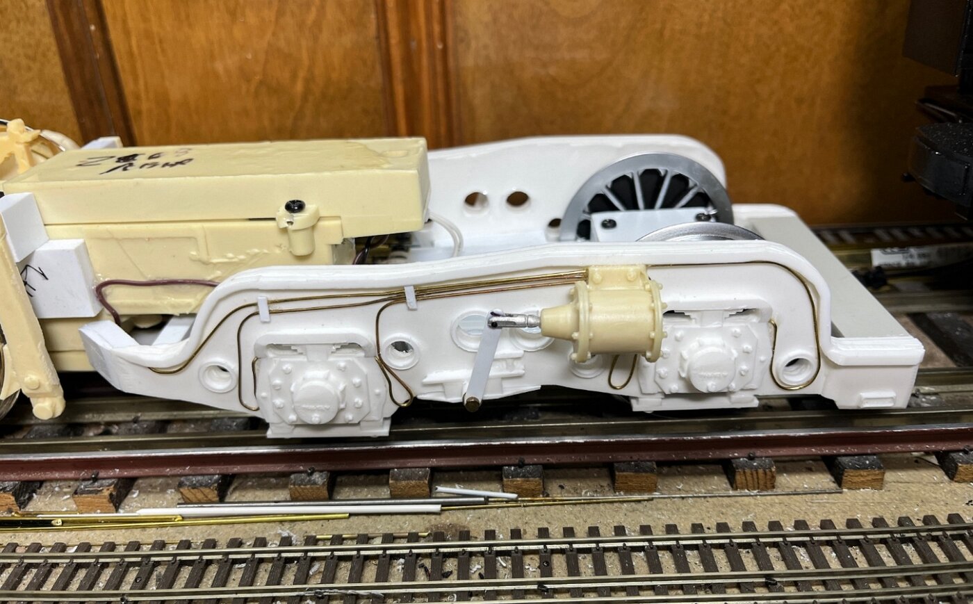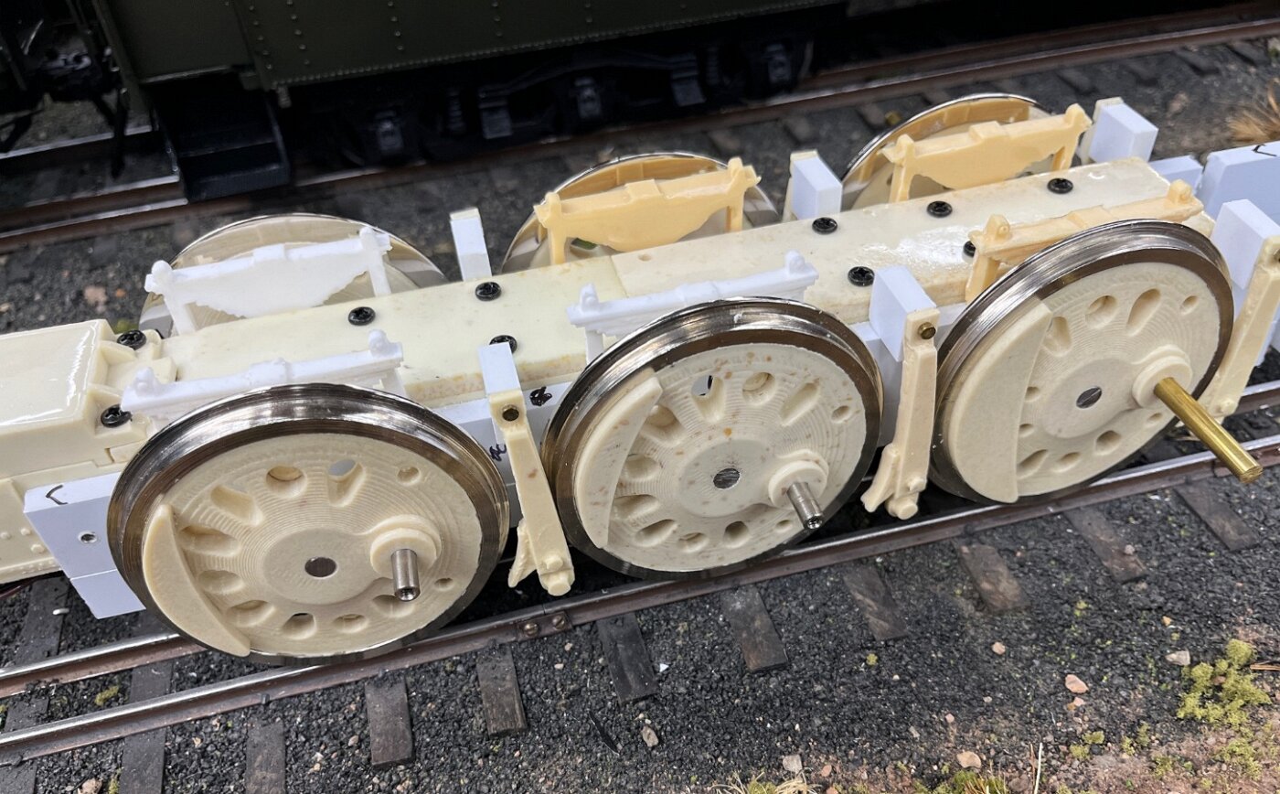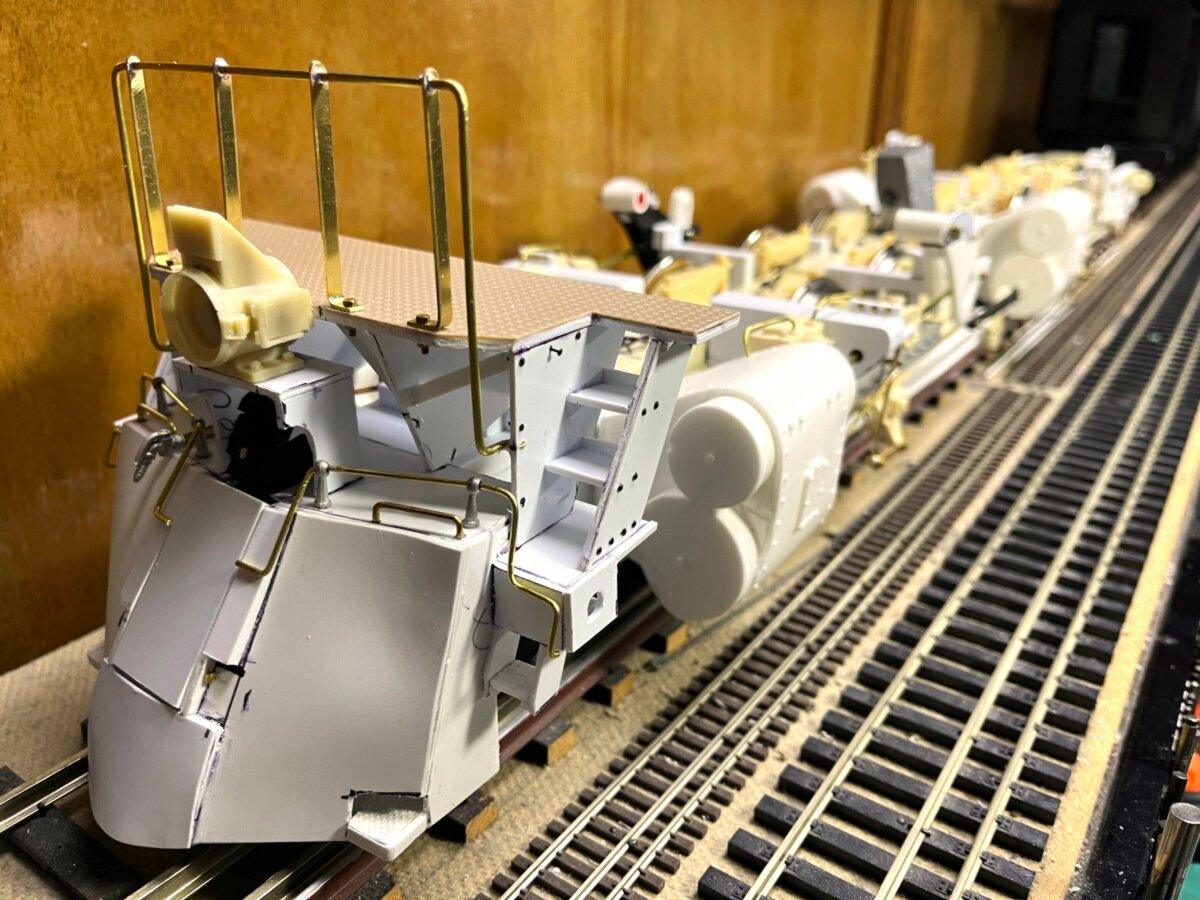 July saw various stages of the chassis built, from motor blocks to rear trucks, the running gear to the pilot and retractable coupler.